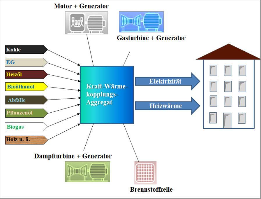 Das Funktionsprinzip ist im Grunde genommen nicht besonders kompliziert. Nach Feststellung des für diesen Prozess am günstigsten zur Verfügung zu stellenden Brennstoffs (oder Brennstoffgemisches) wird mittels eines Motors oder einer Turbine in einem Generator Strom erzeugt. Die bei dem Prozess entstehende Abwärme infolge der Wirkungsgradverluste wird sinnvollerweise zu Heizzwecken genutzt. Es gibt heutzutage bezüglich der Anlagengröße, die von wenigen Kilowatt bis zu etlichen Megabyte reicht, kaum Begrenzungen.