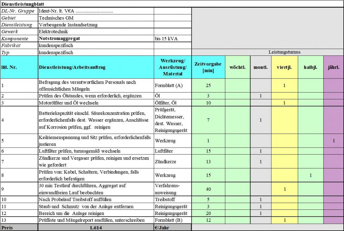 Im Anhang 22 Produkt Wartung Notstrom.xls gibt es eine Berechnungstabelle für die Wartungskosten einer Notstromanlage. Das oben aufgeführte Leistungsprogramm der Wartung kann in dieser Tabelle entsprechend objektkonkret angepasst und ergänzt werden, weil sie entsprechend aufgebaut ist.