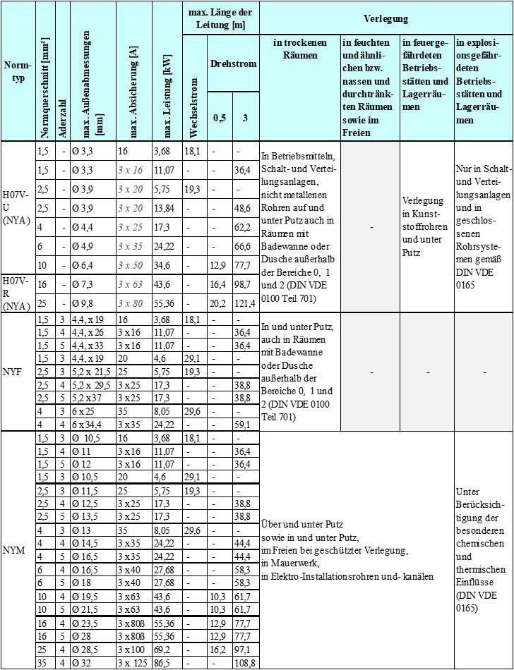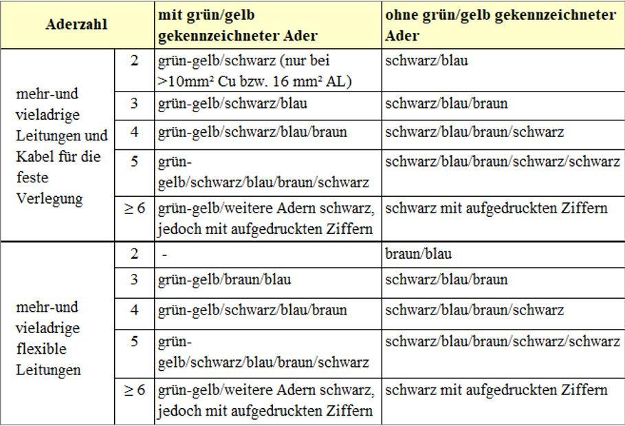 Damit der Elektromonteur bei mehr- oder vieladrigen Leitungen oder Kabeln ihre Bestimmung erkennen und mithin ihre Lage festlegen kann, sind die einzelnen Adern einer jeden Leitung bzw. eines Kabels in unterschiedlichen Farben hergestellt. So sind einadrige bzw. einadrig ummantelte Leitungen schwarz oder grün-gelb. Die grün-gelbe Ader wird ausschließlich als Schutzleiter verwendet. Wenn die Ader blau ist, dient sie überwiegend als neutraler Leiter. Schwarz oder auch braun sind solche Adern, die als sogenannte Phasenleiter (Außenleiter) verwendet werden. Die Farben der Adern von mehr- und vieladrigen Leitungen und Kabeln sind in der folgenden Tabelle als Übersicht dargestellt.