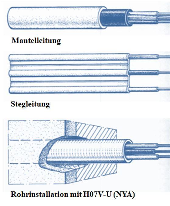 Im üblichen Büro- und Wohnungsbau wird bevorzugt die Stegleitung (NYIF) eingesetzt. Ihre Verlegung ist ausschließlich in trockenen Räumen und dort nur im Putz oder unter Putz erlaubt. Eine Stegleitung ist flach, sodass sie auf der Rohwand bzw. auf dem Beton mit speziellen Techniken direkt befestigt und überputzt werden kann. Im Übrigen ist diese Bedeckung mit Putz keine Kann-, sondern eine Mussbestimmung. Die einzelnen Adern sind in der charakteristischen Weise mit einem Gummisteg zusammengefasst, wie auch die folgende Abbildung zeigt.