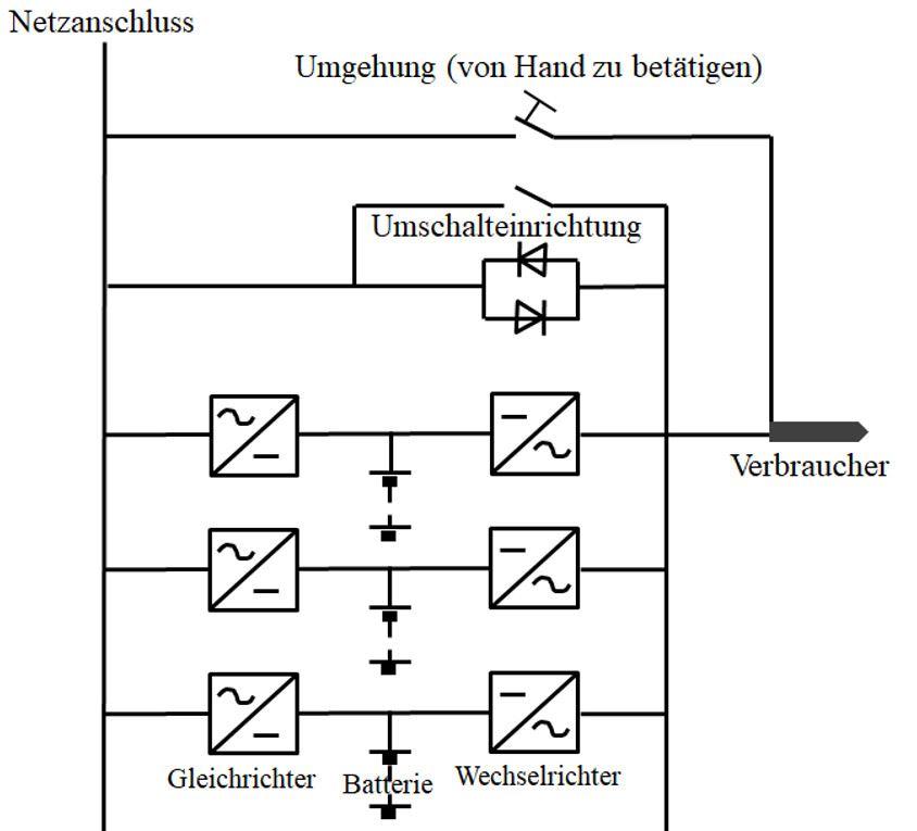 Die Abbildung „Blockschaltbild einer statischen USV-Anlage“ zeigt das Schaltbild einer statischen USV-Anlage mit elektronischer Umschalteinrichtung und Handschaltung. Die Komponenten sind Gleichrichter, nachgeschaltete Wechselrichter und Batteriezwischenkreis.