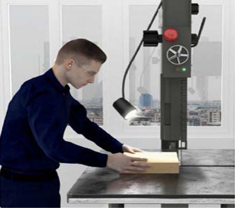 An einer Bandsäge wird nach Anhang C ASR 3.4(23.6 Arbeiten an Holzbearbeitungsmaschinen) der Mindestwert der Beleuchtungsstärke von 500 lx gefordert. Im Bereich des Arbeitsplatzes wirddieser Wert durch die Deckenbeleuchtung erzeugt.Um die Schnittstelle (Gefahrstelle) noch besserauszuleuchten, wird eine zusätzliche Leuchte ander Maschine installiert; die sich direkt auf dasArbeitsgeschehen richten lässt.