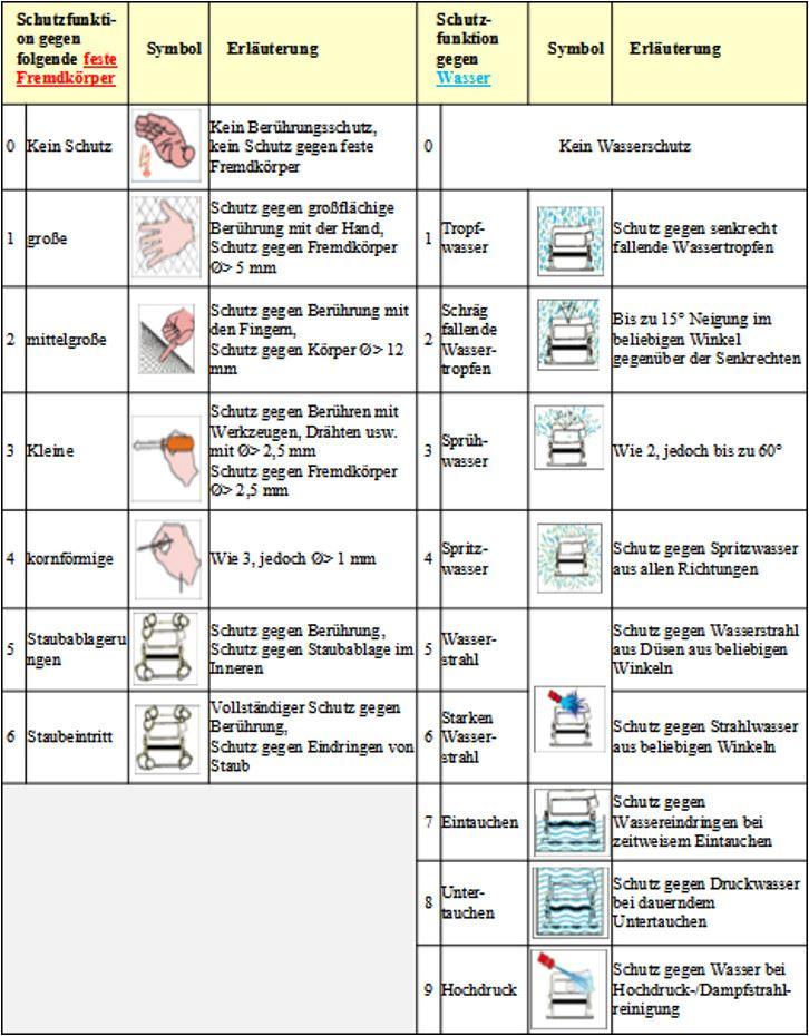 | Schutzart | könnte man auch als Gehäuseschutz bezeichnen definiert den Schutz aktiver Teile gegen Berührung, Eindringen von Fremdkörpern, Flüssigkeiten, insbesondere Wasser und die Stoßfestigkeit |