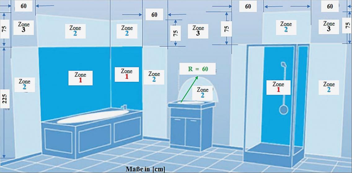Im Folgenden möchten wir beispielhaft über die verschiedenen Bereiche im Badezimmer informieren und mit den entsprechenden IP-Codes bekannt machen. Abhängig vom Feuchtigkeitsgrad gibt es im Badezimmer drei Bereiche. Diese drei Bereiche werden folgendermaßen unterschieden: