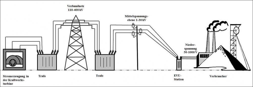Vom Kraftwerk aus, in welchem die Elektroenergie mit unterschiedlichen Methoden erzeugt wird, erfolgt die Energieverteilung. Das geschieht in der Regel durch Freileitungen in einem Verbundnetz (Hochspannungsebene 110-400 kV). Die Energieerzeuger sind über dieses Verbundnetz miteinander verbunden. In der Nähe großer Ansiedlungen bzw. größerer Industrieanlagen wird auf eine sogenannte Mittelspannungsebene, welche 1-30 kV beträgt, heruntertransformiert und in das örtliche Versorgungsnetz eingespeist (EVU-Netz).