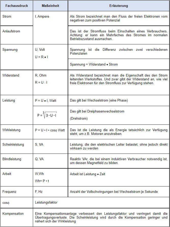 Für den nicht Elektrofachmann ist es erforderlich, zumindest allgemeine Begriffe der Elektrotechnik zu kennen. Die folgende Tabelle enthält einen Überblick.