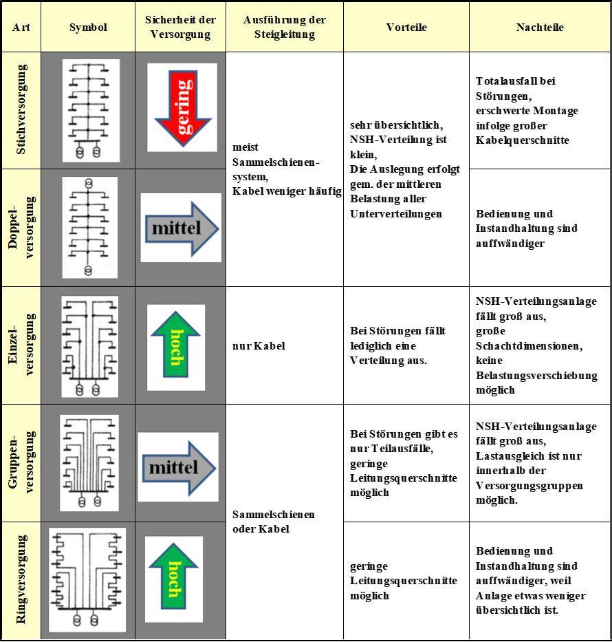 In erster Linie bestimmen die Gebäudeart und deren Leistungsbedarf die Art Form und Größe der Hauptversorgungssysteme für Elektroenergie. Ein weiteres Kriterium für die Auslegung der Systeme ist der unterschiedliche Anspruch auf Versorgungssicherheit. Wenn also „der Strom nie ausfallen darf“, müssen besondere Maßnahmen ergriffen werden. Diese können bestehen aus Redundanz der Versorgung oder einer Notstromversorgung. Es ist klar, dass solche zusätzlichen Maßnahmen die Systeme erheblich verteuern. Die übliche Form ist die Stich- und Gruppenversorgung. Diese trifft zu in erster Linie bei kleineren Objekten wie zum Beispiel Wohnbauten. Dagegen kommt die Ringversorgung zum Einsatz, wenn es beispielsweise bei großen Objekten um eine hohe Versorgungssicherheit geht.