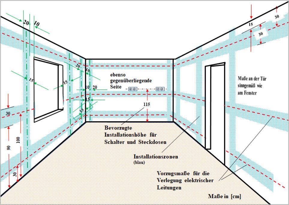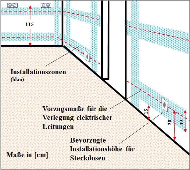 Insbesondere das Facility Management hat vielfältig im Laufe des Immobilien-Lebenszyklus‘ damit zu tun, die Immobilie und ihre Einrichtungen an die Veränderungen in der Organisation anzupassen. Und das soll meist vorgestern fertig sein. Insofern ist es auch eine Hilfe, wenn man weiß, wo Kabel liegen, bzw. liegen könnten und wo auf jeden Fall nicht. Kabel sind aus Sicherheitsgründen und um sie besser auffinden zu können, grundsätzlich parallel zu den Raumkanten zu installieren. Leitungen, die man aus Gründen der Attraktivität des Raumes nicht sehen soll, sind in bestimmten dafür vorgesehenen Zonen zu verlegen, um sie möglichst schnell aufzufinden, oder überhaupt zu wissen, wo sie sich befinden müssten. Die folgenden Schemata zeigen beispielhaft diese lnstallationszonen und die zugehörigen Vorzugsmaße (am Beispiel Wohnungsbau).
