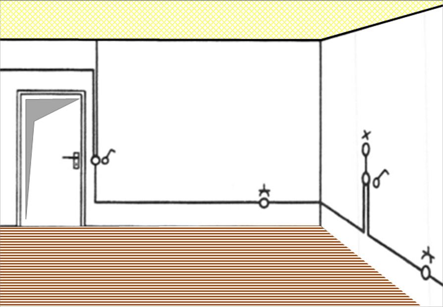 Die beiden folgenden Bilder zeigen diese unterschiedlichen Methoden. Erfolgt die Verwendung von Verbindungsdosen, ist an jedem Verzweigpunkt eine solche einzusetzen. Diese befinden sich dann in der Regel ca. 30 cm unterhalb der Raumdecke.