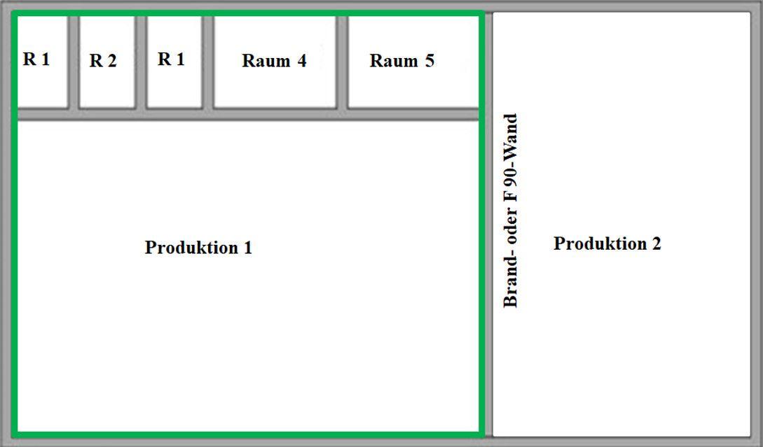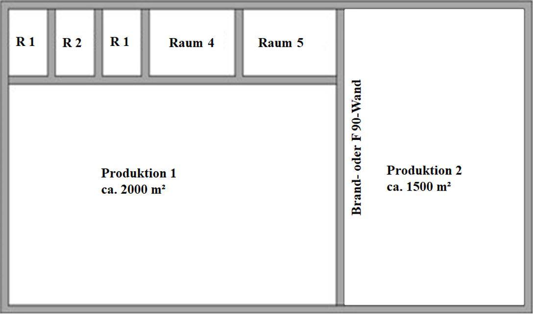 Ein Unternehmen besteht aus den Räumen laut Skizze. Das Brandschutzkonzept fordert eine Brandmeldeanlage für die Produktionshalle 1 und den Büro-/Sozialtrakt (R1 bis 5).