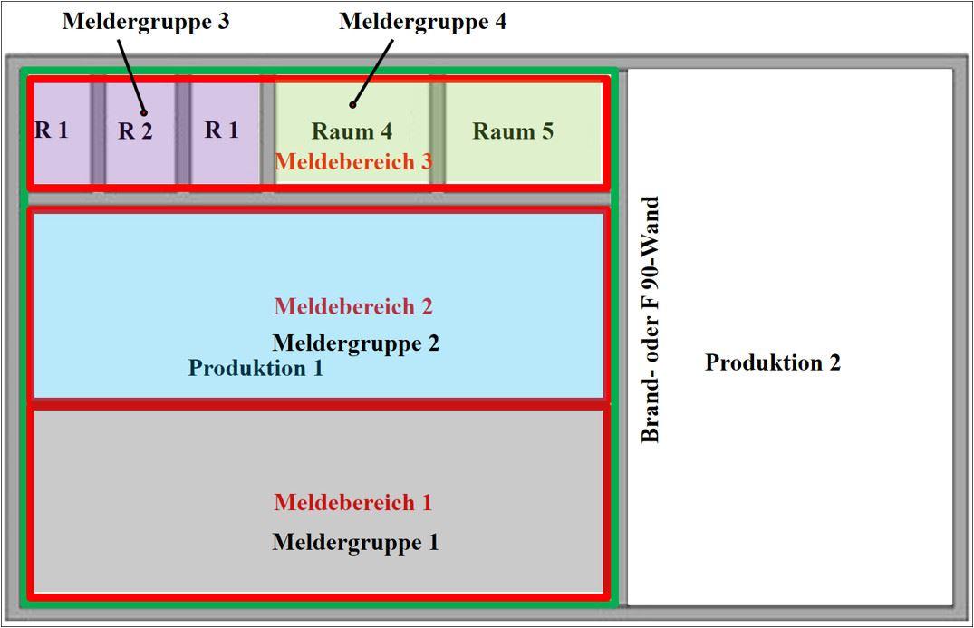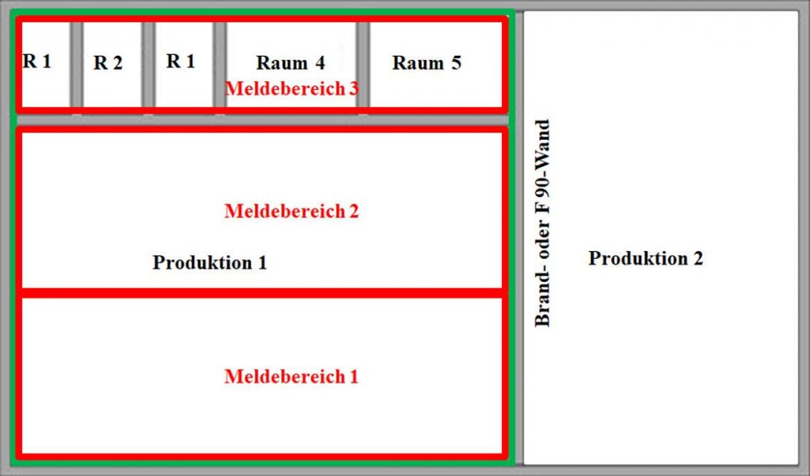Anders ausgedrückt, die Meldebereiche dürfen immer nur benachbarte Räume innerhalb eines Geschosses umfassen. In Treppenhäusern, Schächten, Türmen usw. sind dagegen geschossübergreifende Meldergruppen möglich. Ein Meldebereich ist wie folgt eingegrenzt: