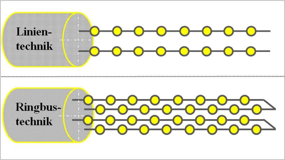 | Mittlere und Großobjekte | Hier wird die Ringbustechnik verwendet. Die Verkabelung des Ringes beginnt an der Zentrale, führt von Melder zu Melder und vom letzten Melder zurück zur BMZ. Jeder Busteilnehmer hat eine eigene Adresse. |