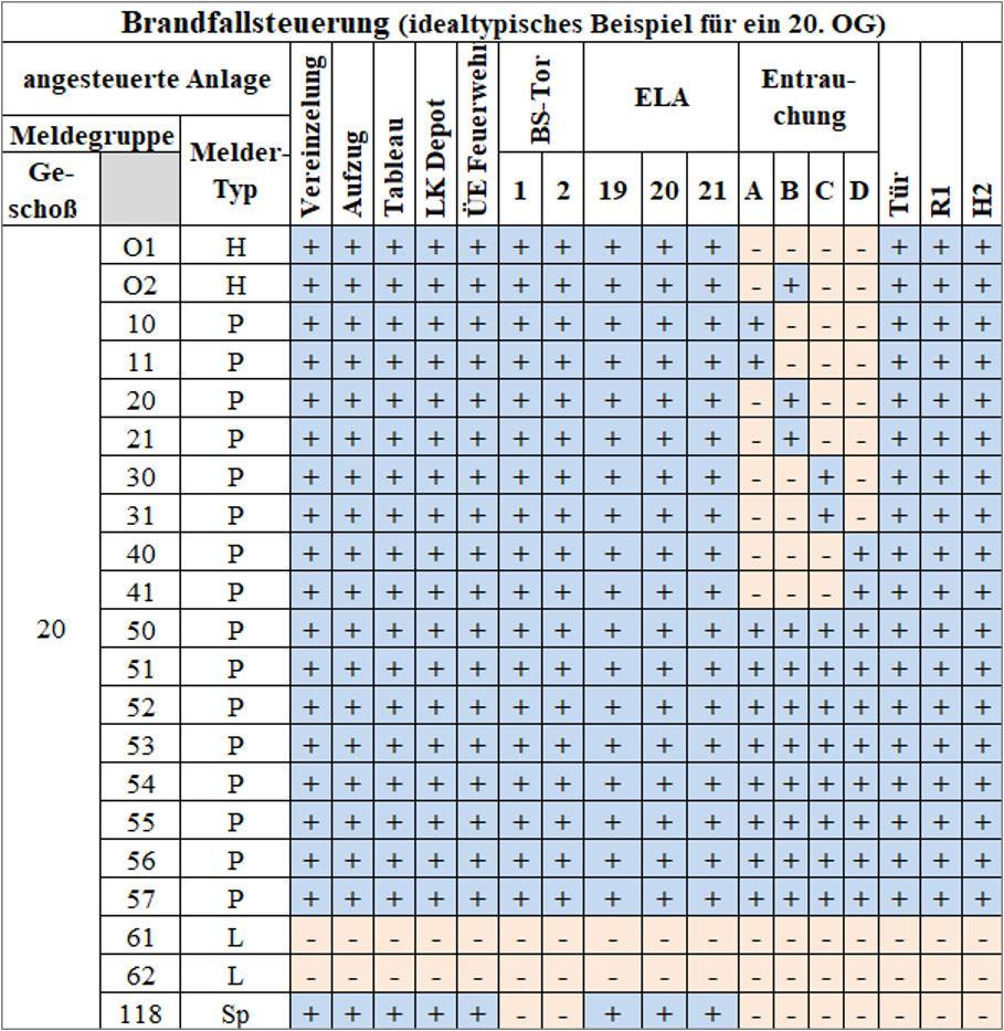 Um dem Planer diese Möglichkeit der Optimierung zu geben, bedarf es bereits im frühen Stadium der sicheren Kenntnis darüber, wie der spätere Betrieb sich gestalten soll. D. h. nichts Anderes, als dass die Brandfallsteuerungen im Wesentlichen bereits im BMA-Konzept zu beschreiben ist. Beim Programmieren und beim Inbetriebnehmen sind dann die hier jeweils beschriebenen Funktionen den Melder- und Steuerungsgruppen zuzuweisen. Auch hier wieder ist die Mitarbeit des Facility Managements dringend gefordert, denn es geht auch um die korrekte Erstellung der Bestandsdokumentation für die nicht nur der Ausdruck einer Anlagenprogrammierung ausreichend ist. Die Bestandsdokumentation muss vielmehr so gestaltet sein, dass die Steuerverknüpfungen einem Mitarbeiter des Betreibers, der die Anlage nicht kennt und den Prüfern sich mit wenigen Blicken erschließt. Es muss also erkennbar sein, welche Steuerungen durch welchen Melder aktiviert werden. Das ist besonders wichtig für Instandhaltung und Wartung. Für eine solche Darstellung eignet sich die so genannte Steuermatrix. Die Abbildung (oben) zeigt den Auszug aus einer Steuermatrix für ein Bürohochhaus, bei dem die Ansteuerung je Etage einzelnen erfolgt.