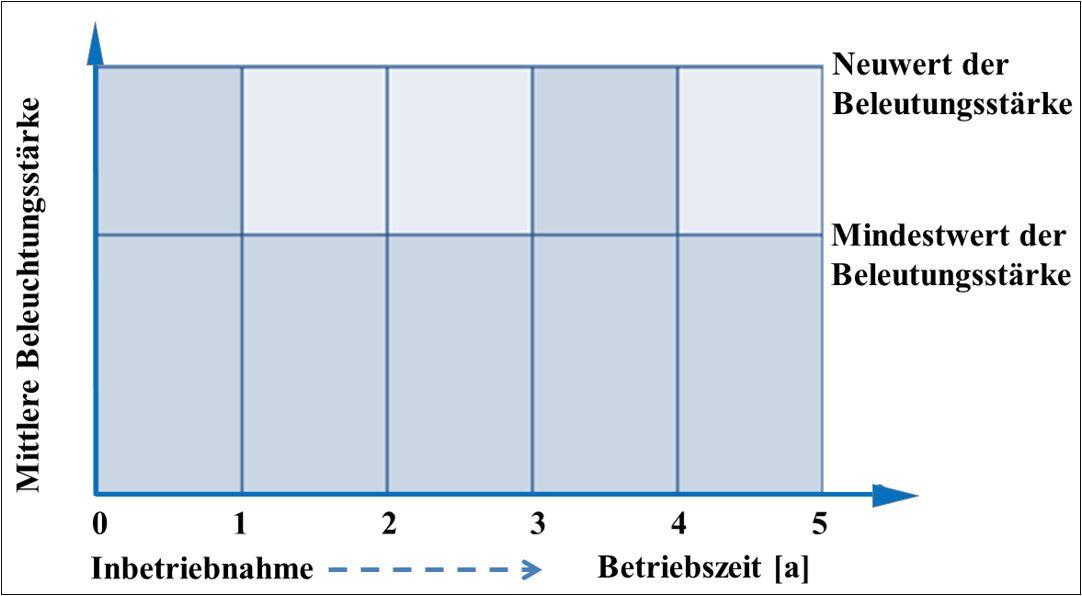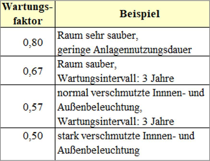 Zur Sicherstellung der lichttechnischen Anforderungen für einen bestimmten Turnus soll die Beleuchtungsanlage mit einem Wartungsfaktor geplant werden. Der Wartungsfaktor legt die Turnusse fest für: