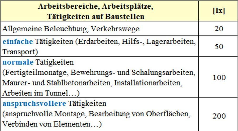 Grundsätzlich sind die geforderten Mindestwerte der Beleuchtungsstärken auf Baustellen geringer als für „normale“ Arbeitsplätze. Die Akzeptanz geringerer Mindestwerte ist ein Kompromiss gegenüber dem ansonsten sehr hohen Bauaufwand für die Beleuchtungsanlage. Auch spielt hierbei eine Rolle, dass die Beleuchtung nur verhältnismäßig kurze Zeit benötigt wird (temporäre Arbeitsplätze mit ständiger Veränderung, zumeist keine Nachtarbeit).