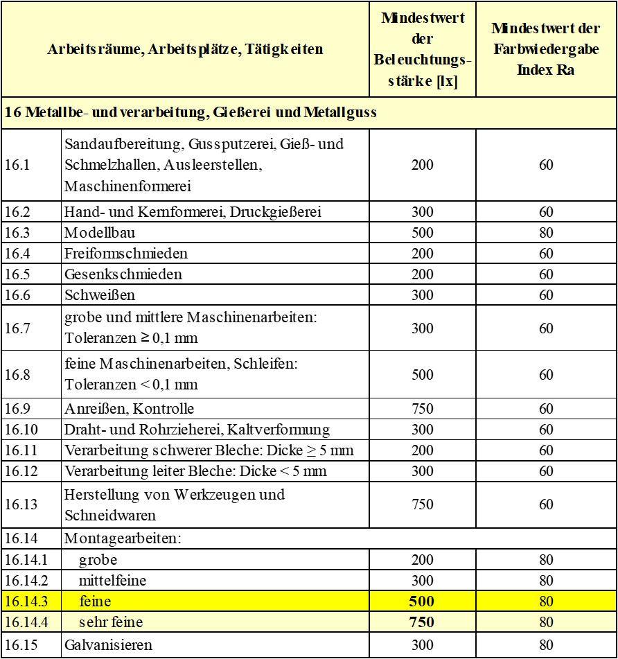 Aufgrund der Verschiedenheit der Geräte wird Punkt 16.14 „Montagearbeiten - feine“ gewählt, so dass der Arbeitsplatz mit 500 lx zu beleuchten ist. Sollten auch sehr feine Montage oder Kontrollarbeiten zu erledigen sein, werden 750 lx benötigt.