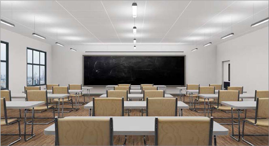 Das obere Bild ist insofern nennenswert, als in diesem Raum sich zwei unterschiedliche Beleuchtungssysteme befinden. Zum einen handelt es sich um die eigentliche Raumbeleuchtung, also die Arbeitsplatzbeleuchtung der hier sitzenden Mitarbeiter/innen, und zum anderen um die spezielle Beleuchtung der Tafel. Dieses Beispiel führt uns zu der allgemeinen Regel, dass die Anwendung einer auf den Bereich des Arbeitsplatzes bezogenen Beleuchtung dann gegeben sein kann, wenn die Anordnung der Arbeitsplätze und deren Umgebungsbereiche bekannt sind, und/oder wenn verschiedene Arbeitsplätze innerhalb eines Raumes unterschiedliche Beleuchtungsbedingungen erfordern (wie zum Beispiel Arbeitstische und Tafel).