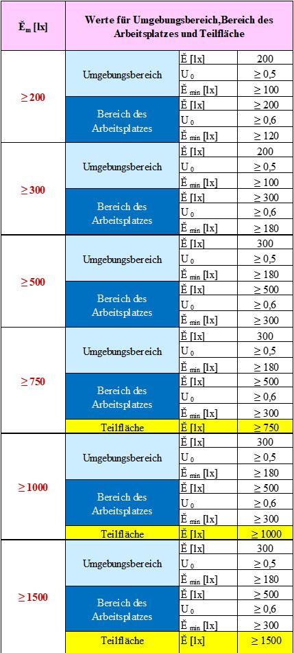 Die folgende Tabelle enthält die entsprechenden vorgegebenen verknüpften Werte, für die Abstufung der Beleuchtungsstärken für den Bereich des Arbeitsplatzes, den Umgebungsbereich und der Teilfläche.