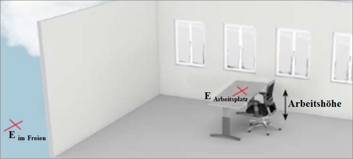 Die Messung der Beleuchtungsstärken innen und außen erfolgt an zuvor festgelegten Punkten. Insbesondere außen ist darauf zu achten, dass die Messung an einer unverbauten Stelle ohne Schatten und reflektierenden Einfluss erfolgt. Zeitgleich wird die Beleuchtungsstärke im Raum ermittelt.