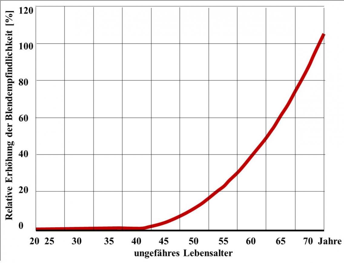 Leider geht mit der nachlassenden Seefunktion im Alter auch die Blendempfindlichkeit in die Höhe. Wie die untenstehende Kurve zeigt, steigt die Blendempfindlichkeit beispielsweise zwischen dem 60. und 65. Jahr, also in nur fünf Jahren relativ genauso stark, wie sie bis zum 50. Lebensjahr angestiegen ist, also um ca. 20 %. Auch ist bekannt, dass dies nicht von heute auf morgen geht, sondern ein schleichender Prozess ist. Das hat zur Folge, dass Beschäftigte gegen Ende ihrer Berufstätigkeitszeit viel schwieriger sehen können, als es ihnen selbst bewusst ist. Also ist es am Facility Management, diesen Zusammenhang zu kennen, zu verstehen und mit den entsprechenden Maßnahmen auszugleichen.