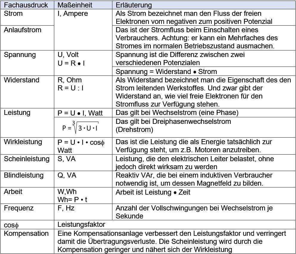 Für den nicht Elektrofachmann ist es erforderlich, zumindest allgemeine Begriffe der Elektrotechnik zu kennen. Die folgende Tabelle enthält einen Überblick.