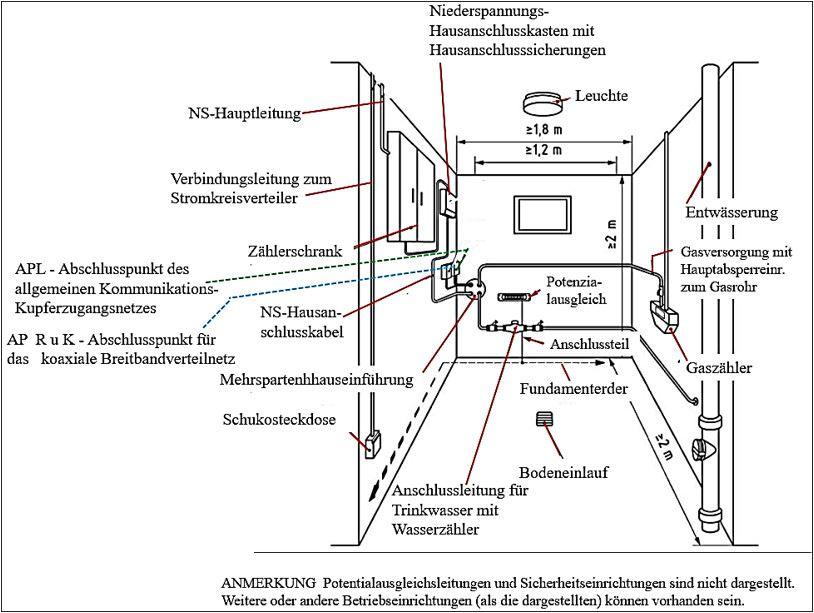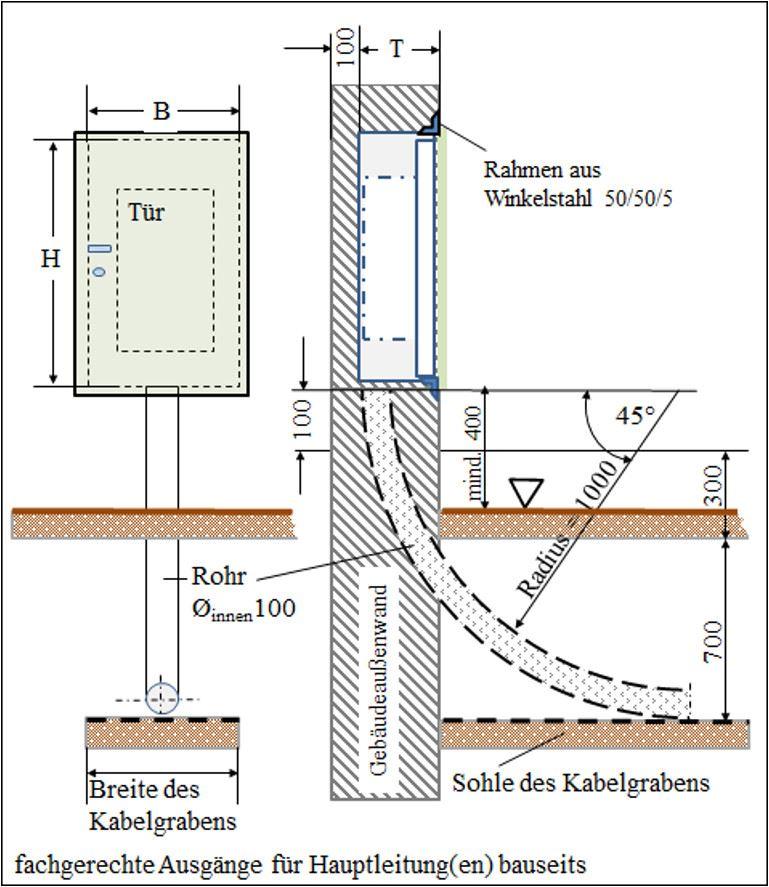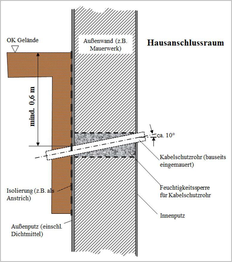 Diese Abbildung verweist insbesondere auf die bei der Durchführung des Kabelschutzrohres zu beachtenden Gegebenheiten. Auf keinen Fall darf die Durchführung in irgendeiner Weise das Bauwerk negativ beeinträchtigen oder gar das Eindringen von Feuchte ermöglichen. Bei der Planung der Raumaufteilung des Gebäudes ist zu beachten, dass Hausanschlussräume stets an den Gebäudeaußenwänden, die die Durchführung enthalten, liegen müssen.
