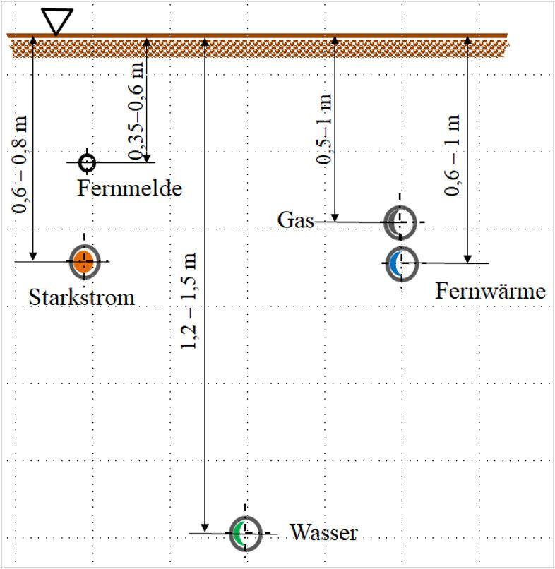 An anderer Stelle wurde bereits über die Tiefen zu verlegender Leitungen ausgeführt. An dieser Stelle wird noch einmal darauf verwiesen, welche Tiefen unter der Geländeoberfläche die entsprechenden Leitungen bei der Hauseinführung haben müssen. Das Stromkabel liegt bei etwa 60-80 cm unterhalb OK Gelände und wird von dort aus in das Gebäude eingeführt.